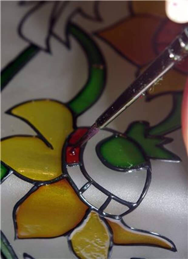 9. Я обычно начинаю заливку с мелких деталей, а фон заливаю последним. Витражную краску лучше наносить таким образом, чтобы не нужно было размазывать ее кистью, как, например, акриловую краску. То есть, нужно набрать краску на кисть и поставить каплю, затем следующую и так далее. Краска должна заполнять контур почти до верха. Когда краска высохнет, она ровно уляжется на поверхность.