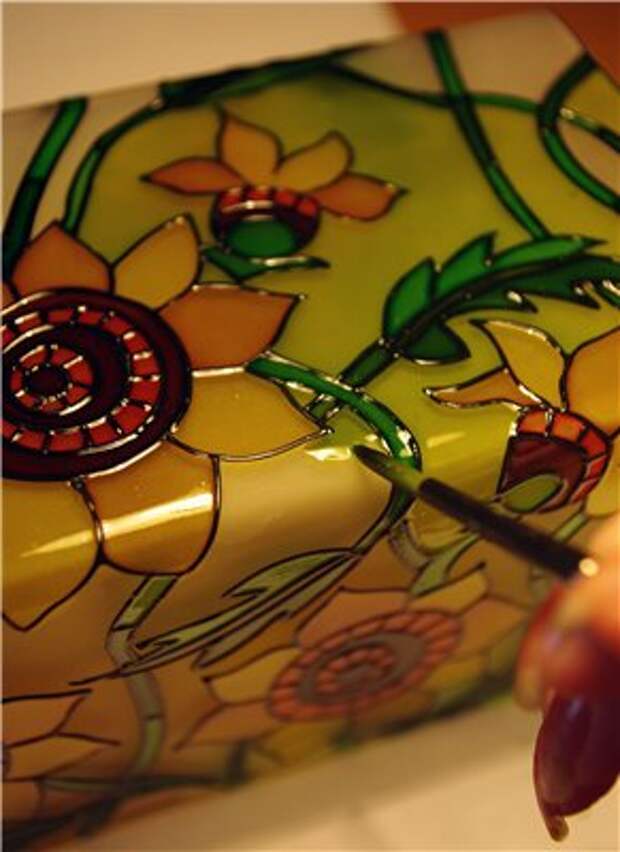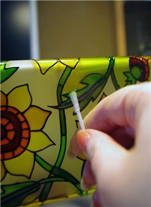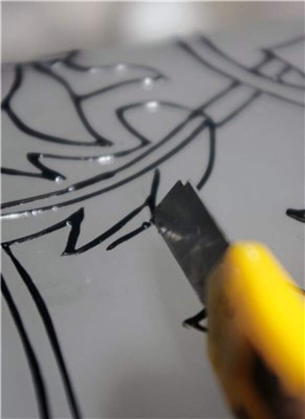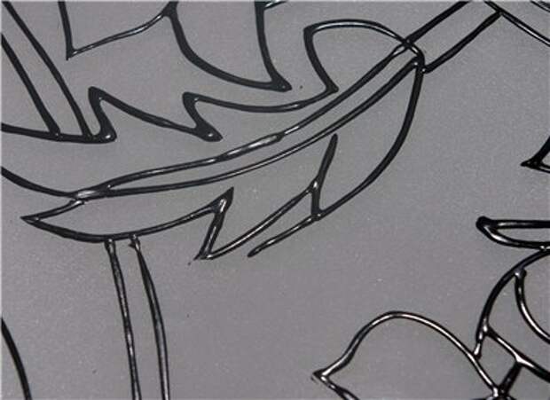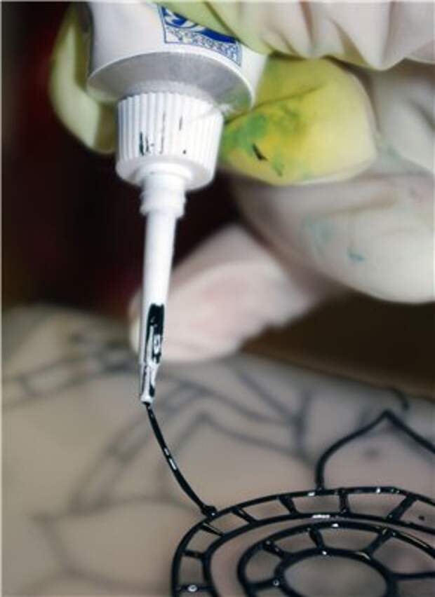 6. Обезжириваем поверхность. Наносим контур.Для того чтобы линия получилась ровной необходима некоторая сноровка. Но в любом случае, очень важно чтобы рука опиралась на стол, а не висела в воздухе. Так же важно, чтобы толщина линии была везде одной. Для этого нужно, чтобы давление на тюбик с контуром было всегда одинаковым. Этого можно добиться, загнув на один оборот конец тюбика.