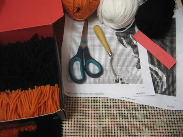 Нам потребуется:жёсткая канва "страмин",схема,ножницы,нитки полушерсть,крючок по ковроткачеству.